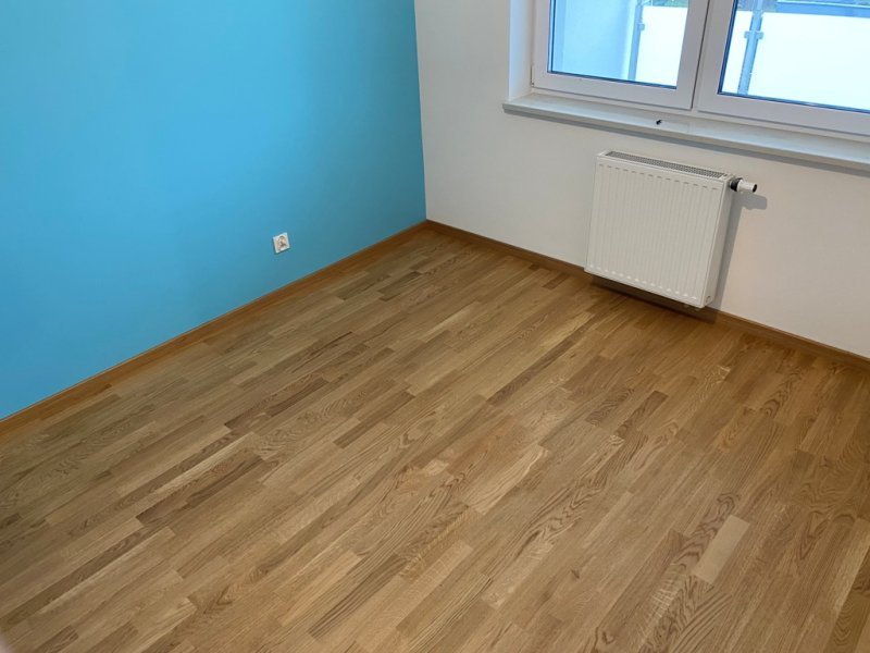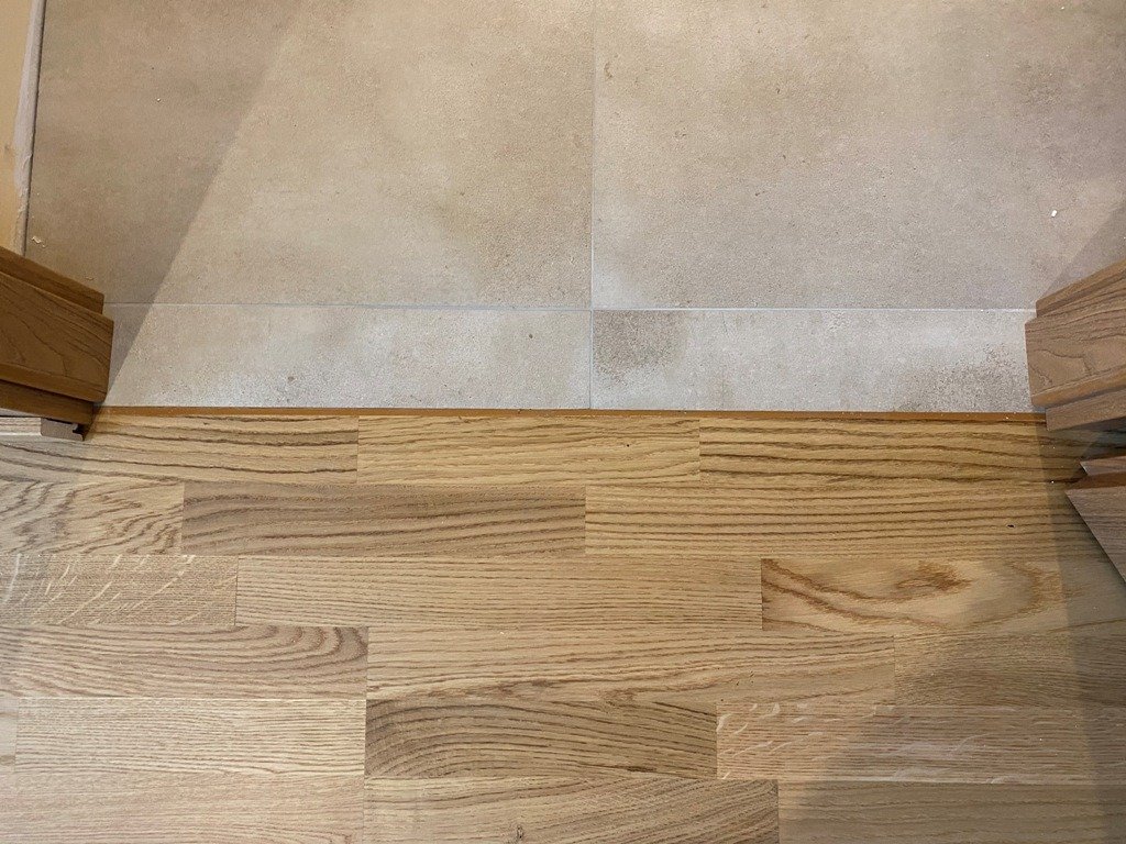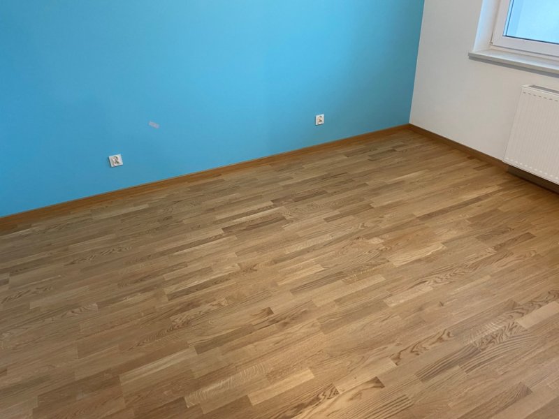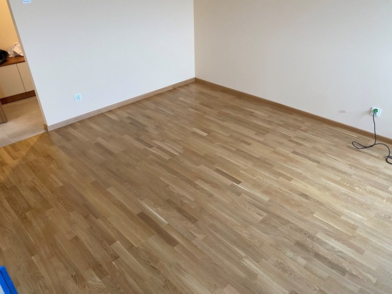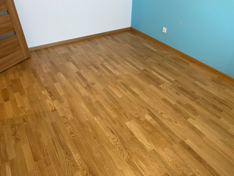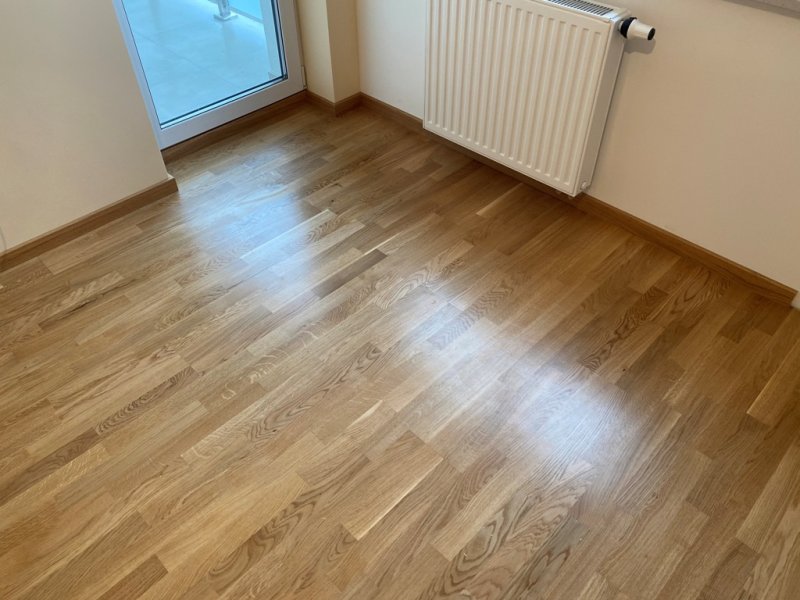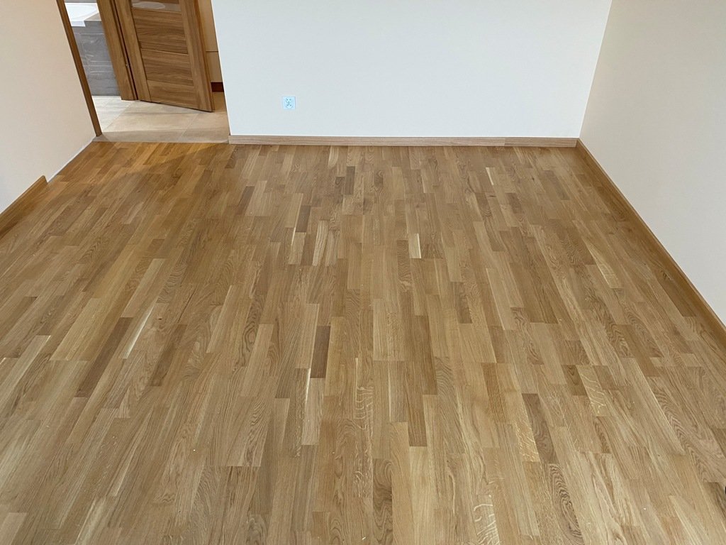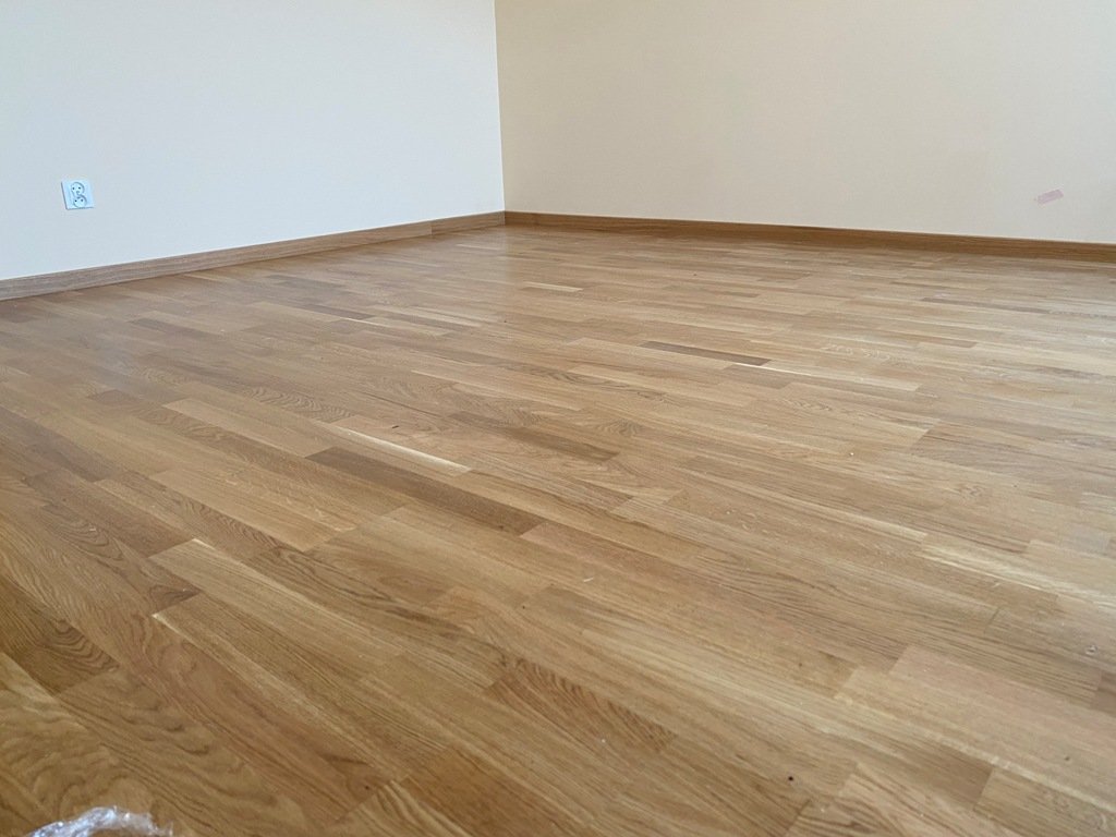 Montaż podłogi w budynku mieszkalnym, Dąb Classic Four4Her wykończony lakierem, deska szczotkowana. Dodatkowo zamontowaliśmy listwy dobrane pod kolor podłogi – Dąb Europejski lakierowane o profilu 60×16.