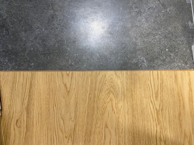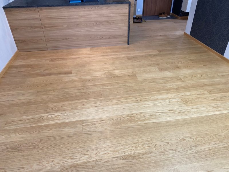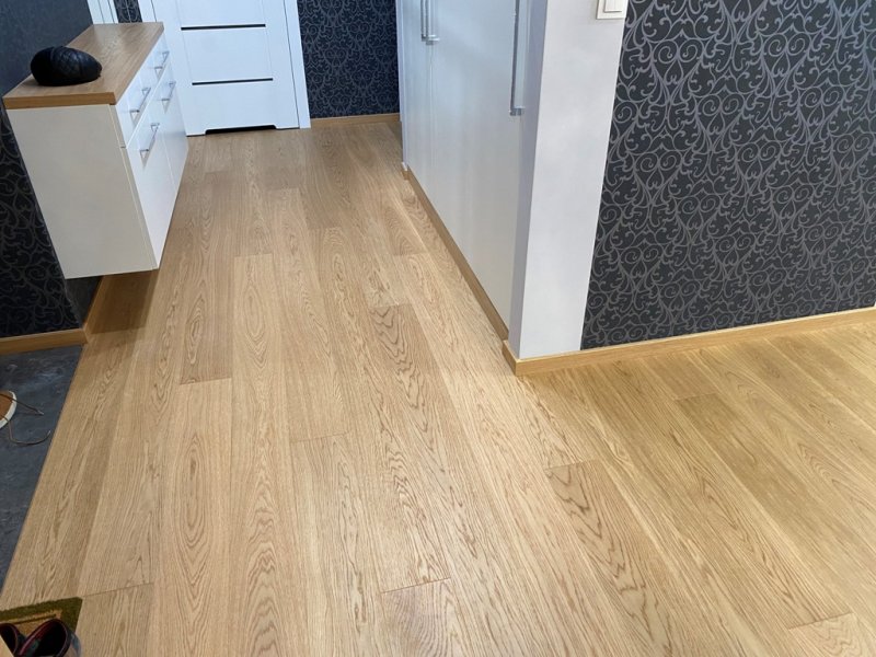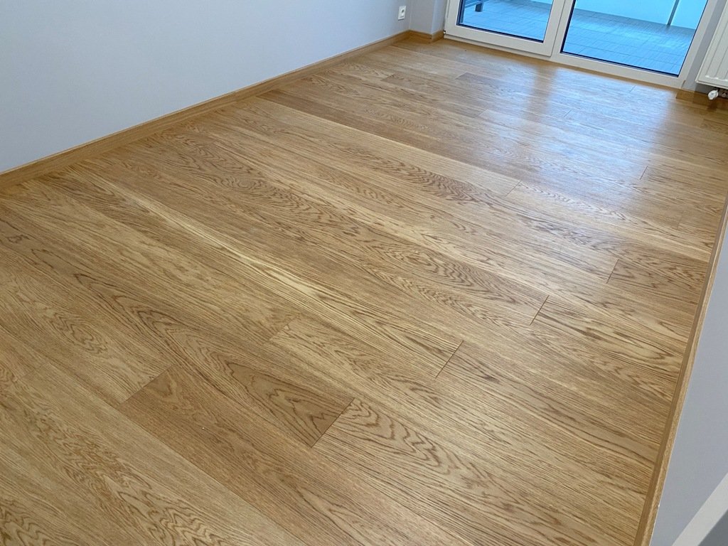 Montaż podłogi w budynku mieszkalnym, Dąb Elegance 1R wykończony lakierem, deska szczotkowana i fazowana czterostronnie. Dodatkowo zamontowano listwy Dąb Europejski lakier, szczotkowane o profilu 60×16. Obróbki przy gresie zostały wykonane przy pomocy elastycznego kitu, dobranego pod kolor podłogi.