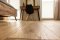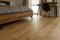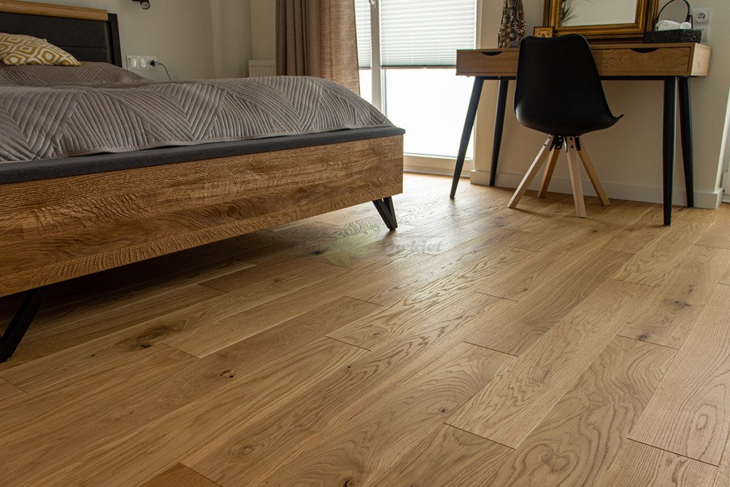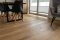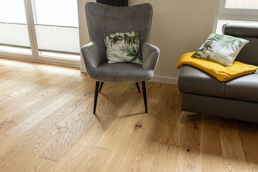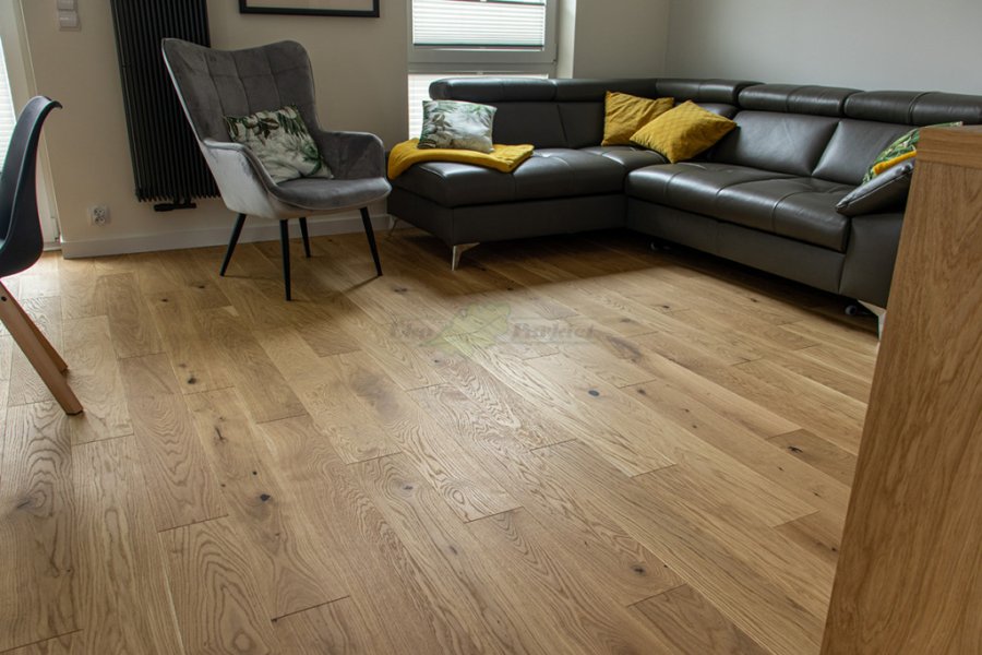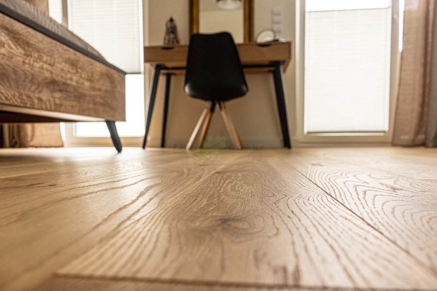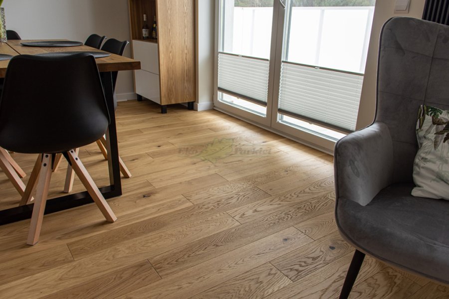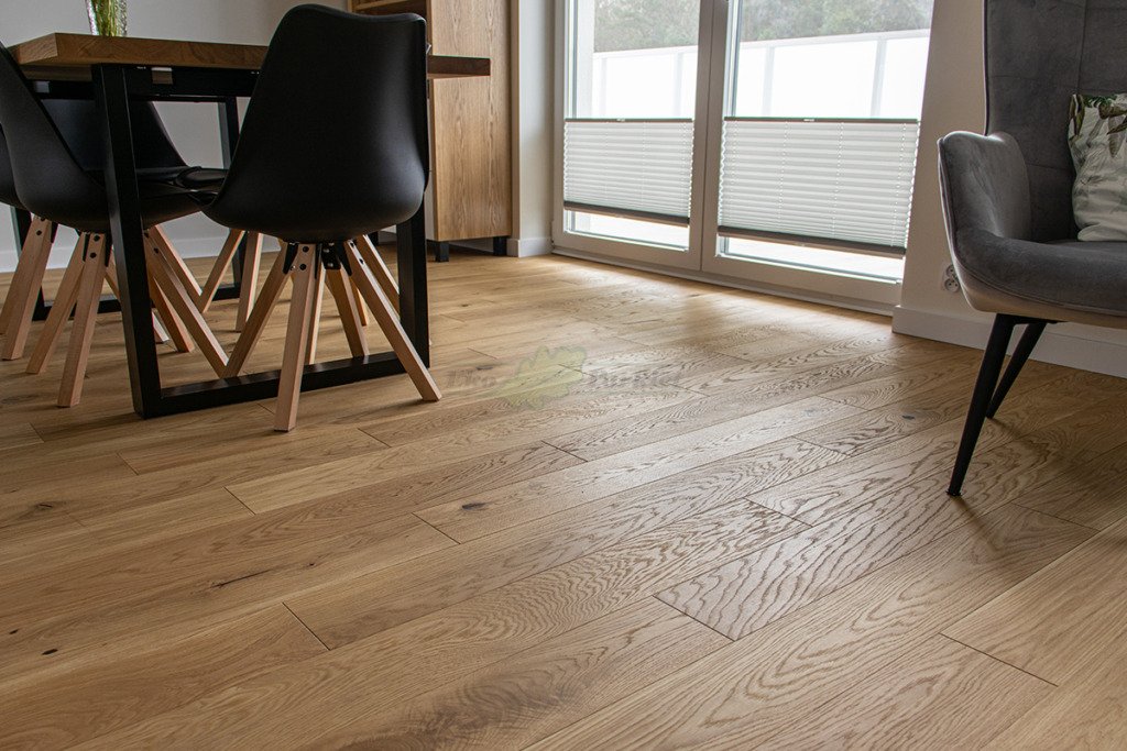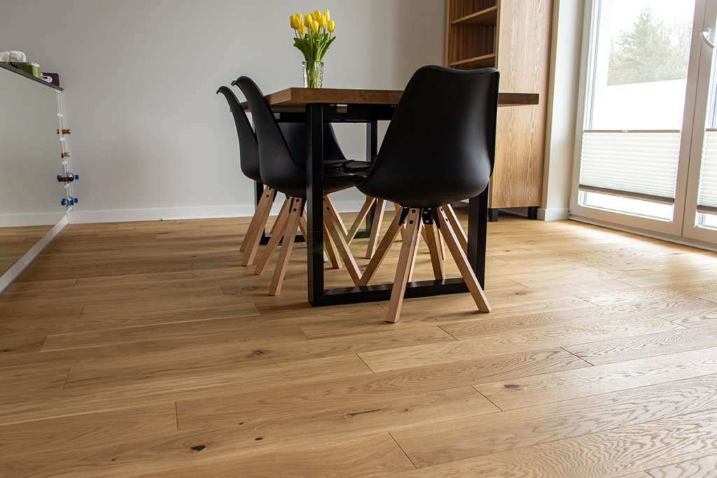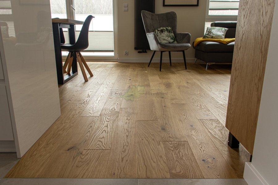 Montaż podłogi w budynku mieszkalnym, Dąb Reflection kl. Cottage. Deska wykończona transparentnym olejem ECO, szczotkowana i fazowana czterostronnie. Między gresem, a podłogą drewnianą zostały wykonane dylatacje w formie silikonu elastycznego firmy Beko.