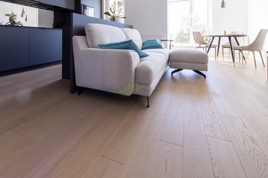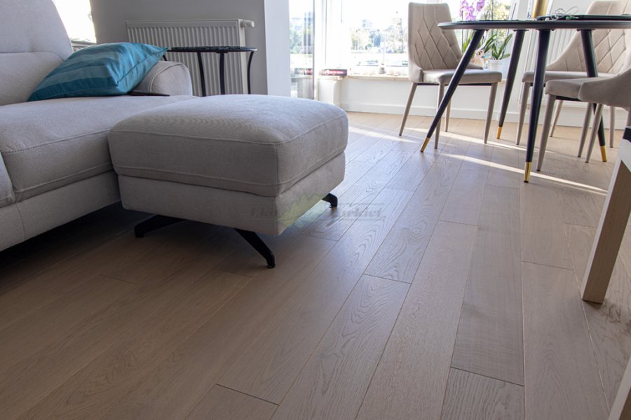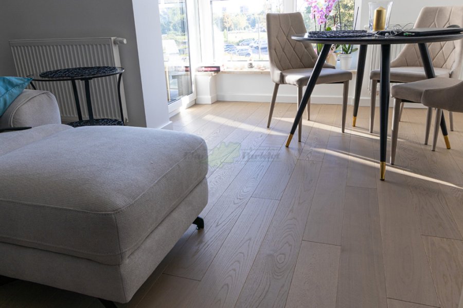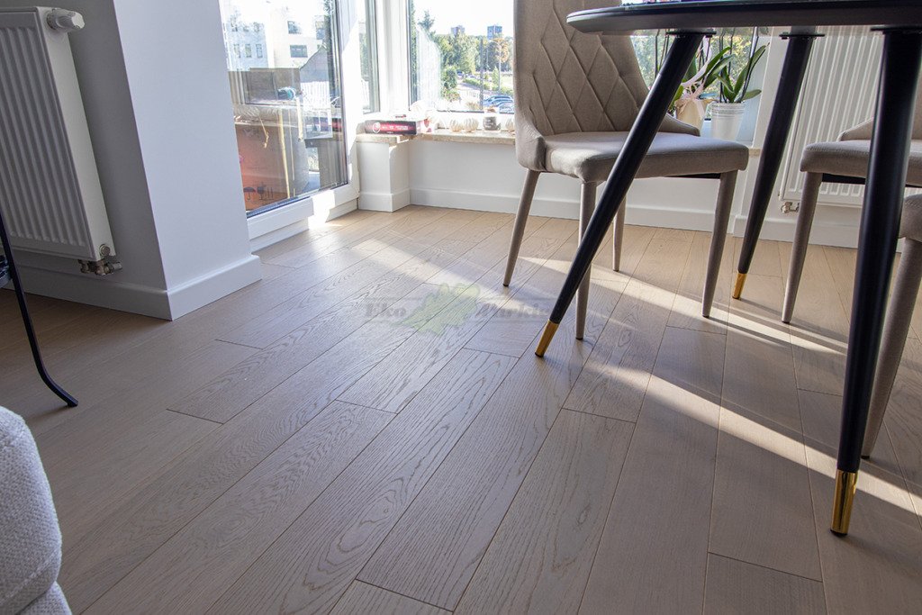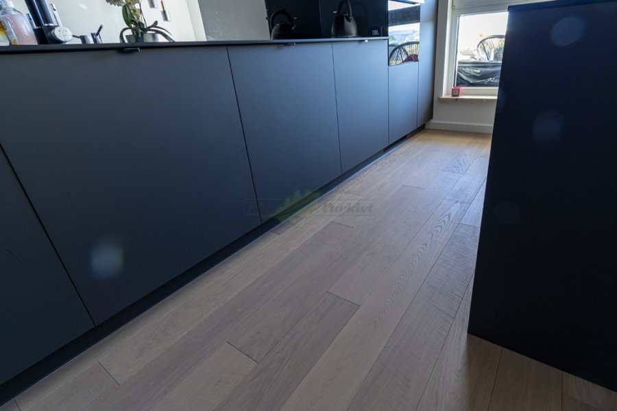 Montaż podłogi w budynku mieszkalnym, deska dwuwarstwowa Dąb Grey Moon klasa Natur wykończona olejem extra szarym UV, szczotkowana i fazowana czterostronnie. Między gresem, a podłogą została wykonana dylatacja przy pomocy silikonu elastycznego firmy Beko.