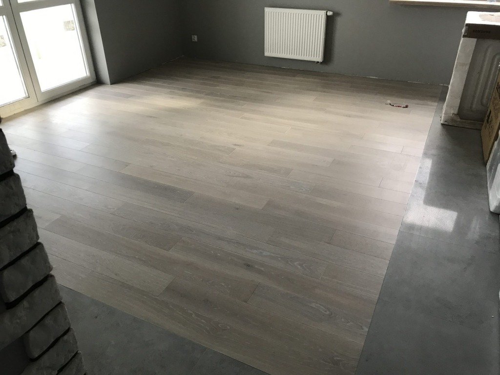 Montaż podłogi w budynku mieszkalnym, Dąb White Pearl wykończony lakierem, deska szczotkowana i fazowana czterostronnie. Deska bielona pięknie komponuje się z szarymi płytkami.