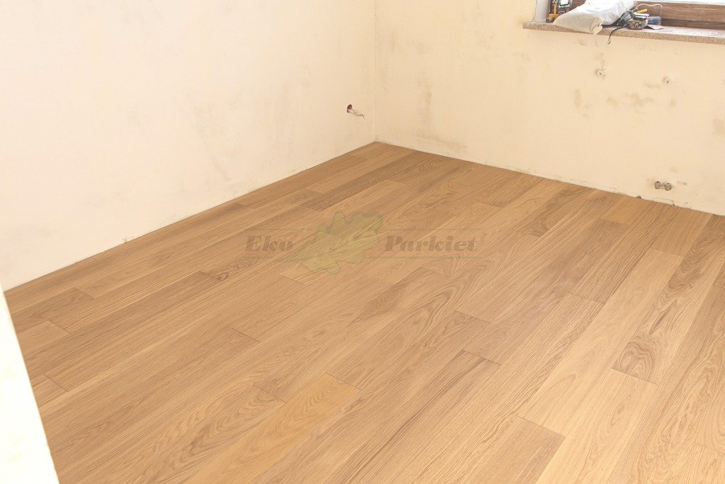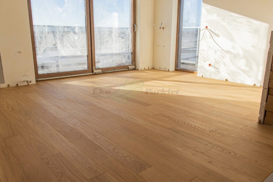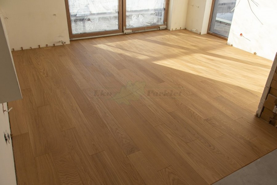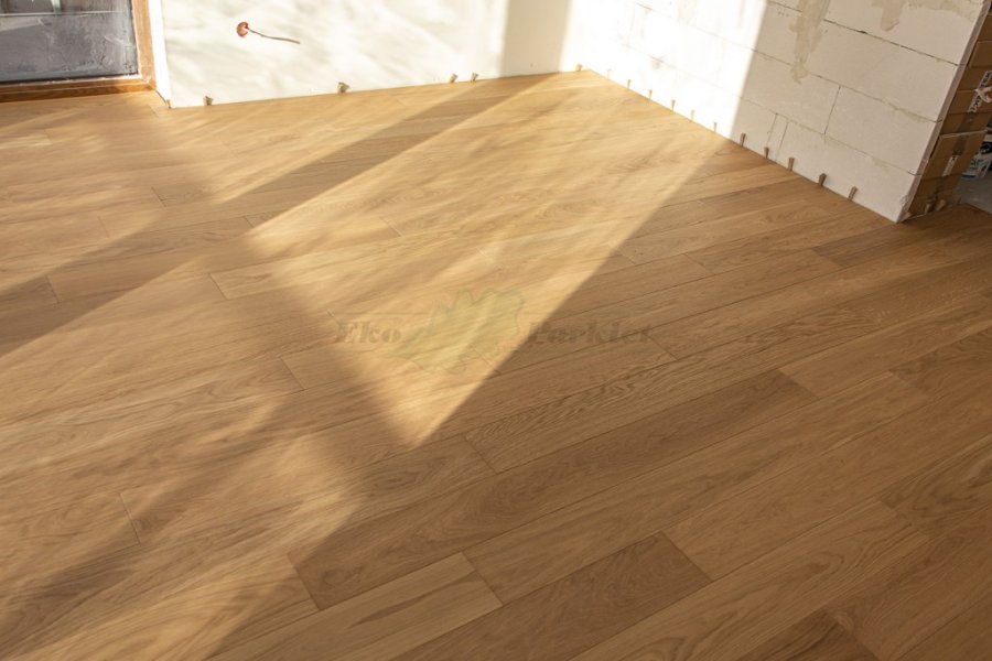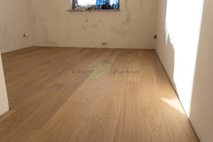 Montaż podłogi w budynku mieszkalnym, deska dwuwarstwowa Dąb Pure Forest klasa Natur wykończona lakierem podbielanym UV, szczotkowana i fazowana czterostronnie. Między gresem, a podłogą została wykonana dylatacja przy pomocy korku. W dylatacji przy oknach tarasowych został zastosowany silikon elastyczny firmy Beko.