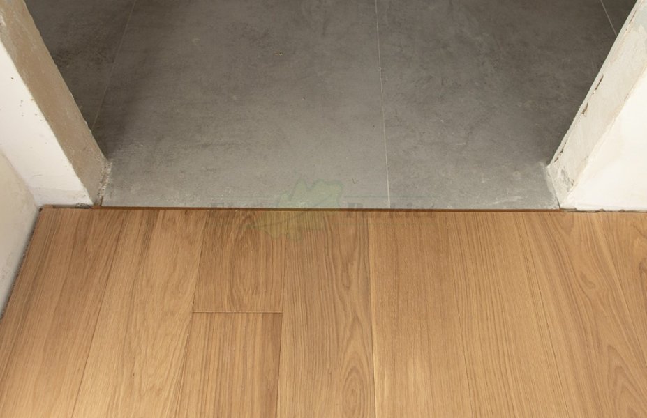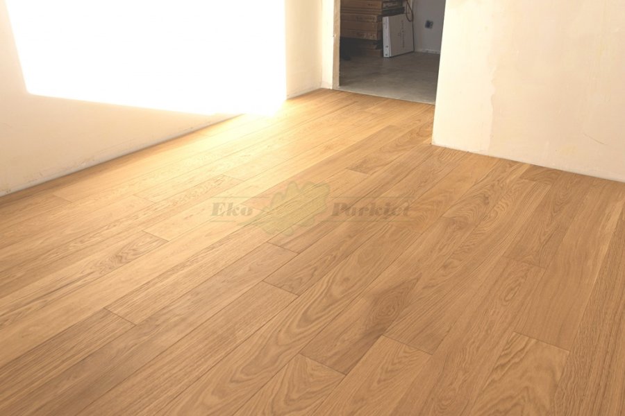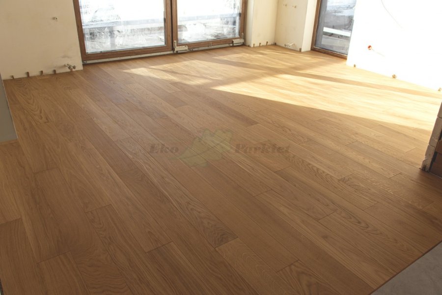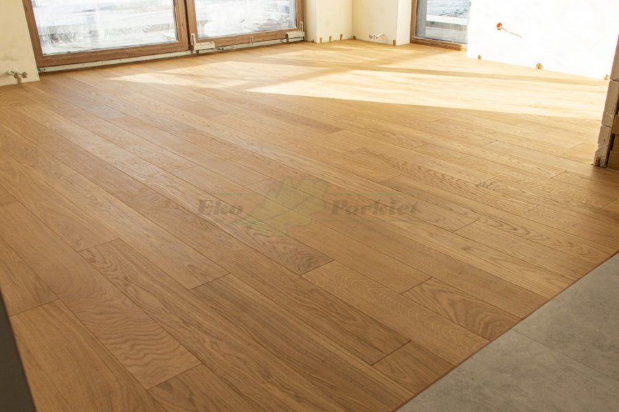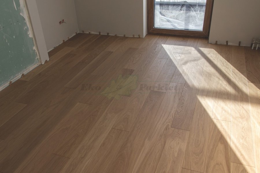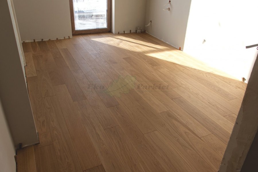 Montaż podłogi w budynku mieszkalnym, deska dwuwarstwowa Dąb Pure Forest klasa Natur wykończona lakierem podbielanym UV, szczotkowana i fazowana czterostronnie. Między gresem, a podłogą została wykonana dylatacja przy pomocy korku. W dylatacji przy oknach tarasowych został zastosowany silikon elastyczny firmy Beko.