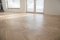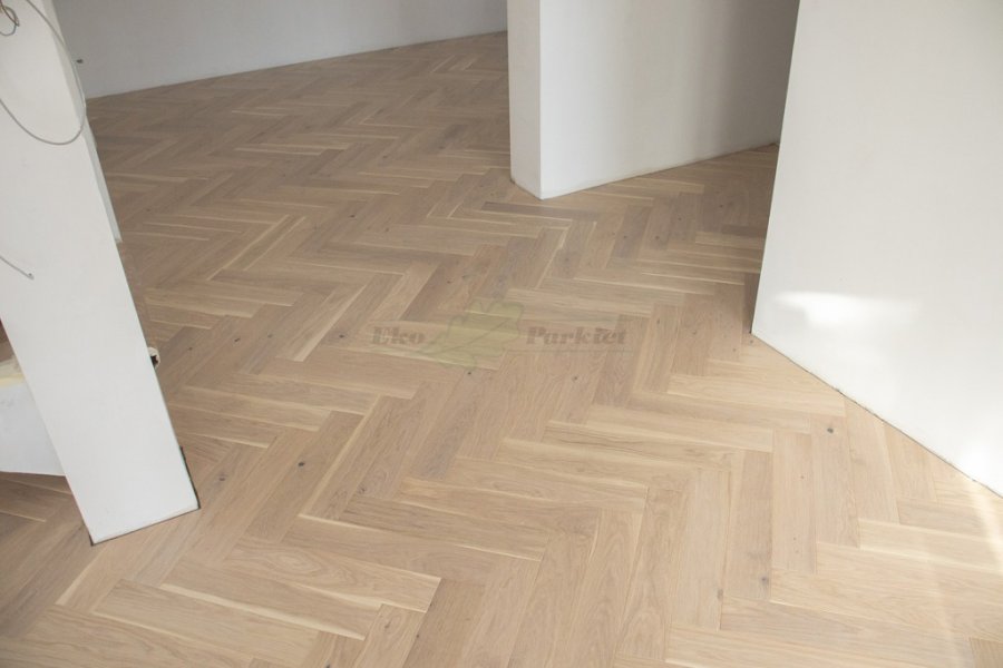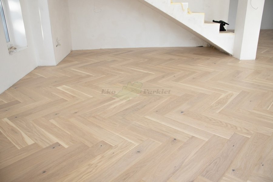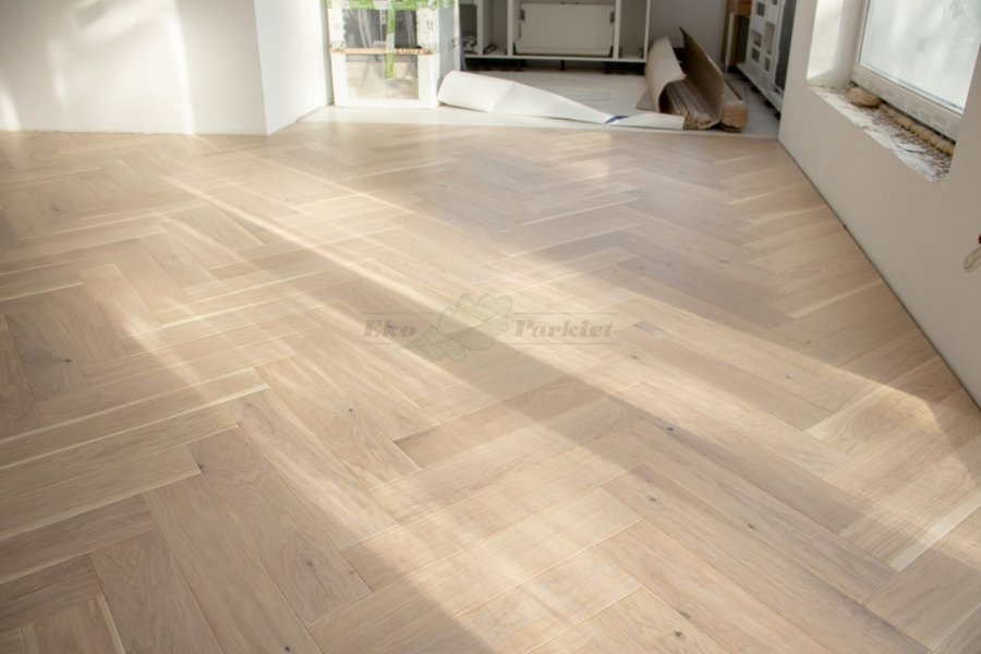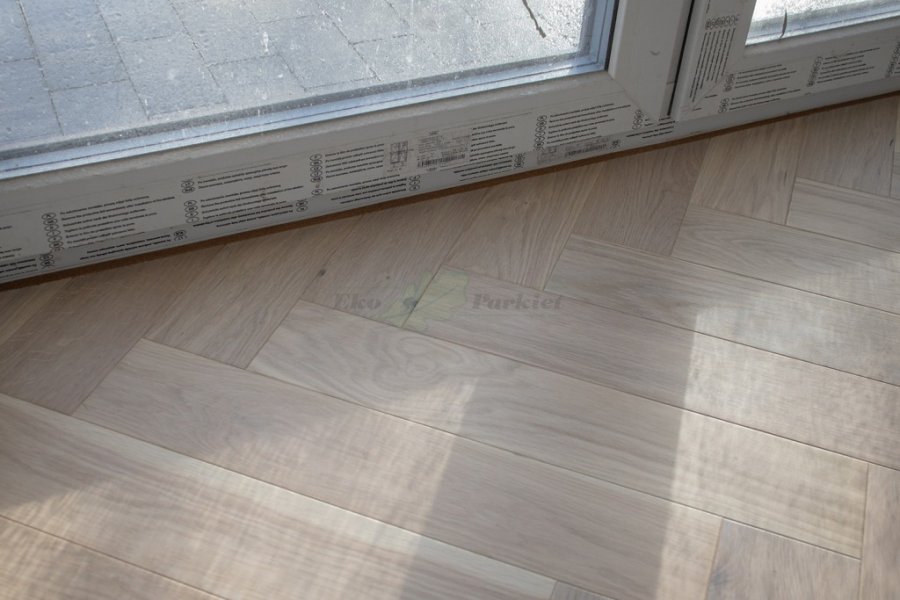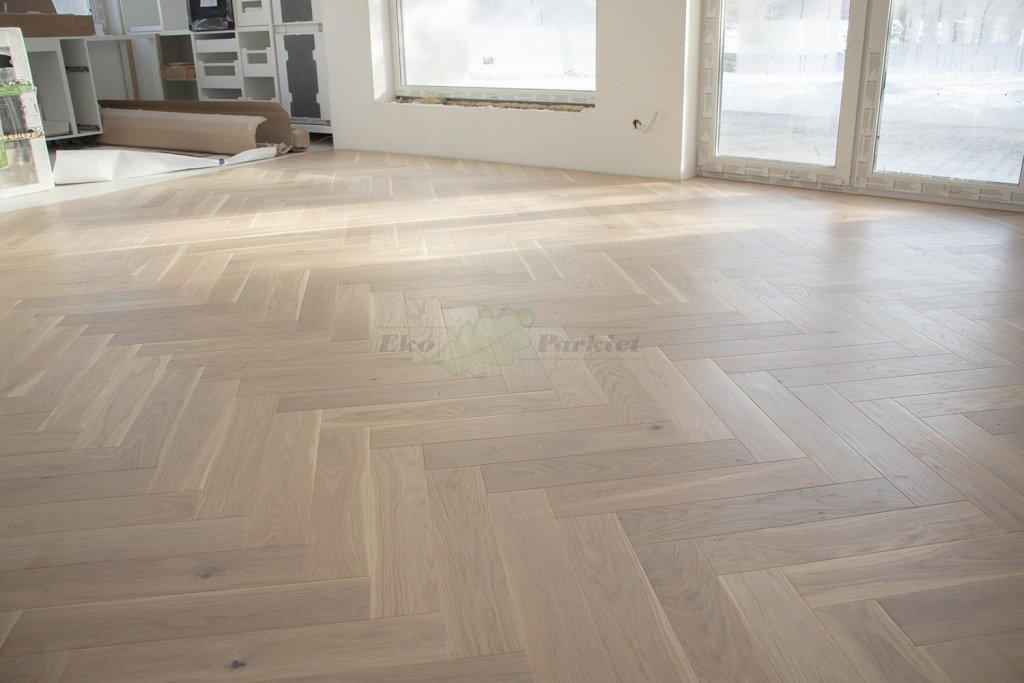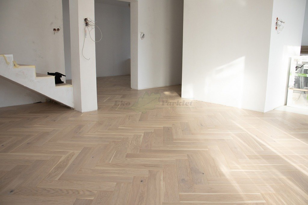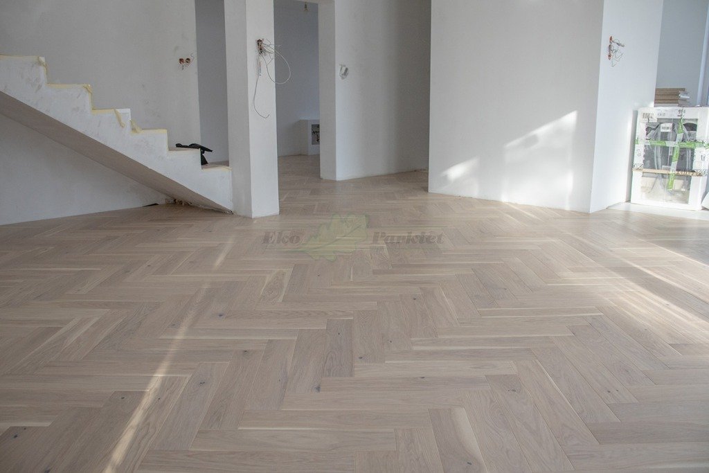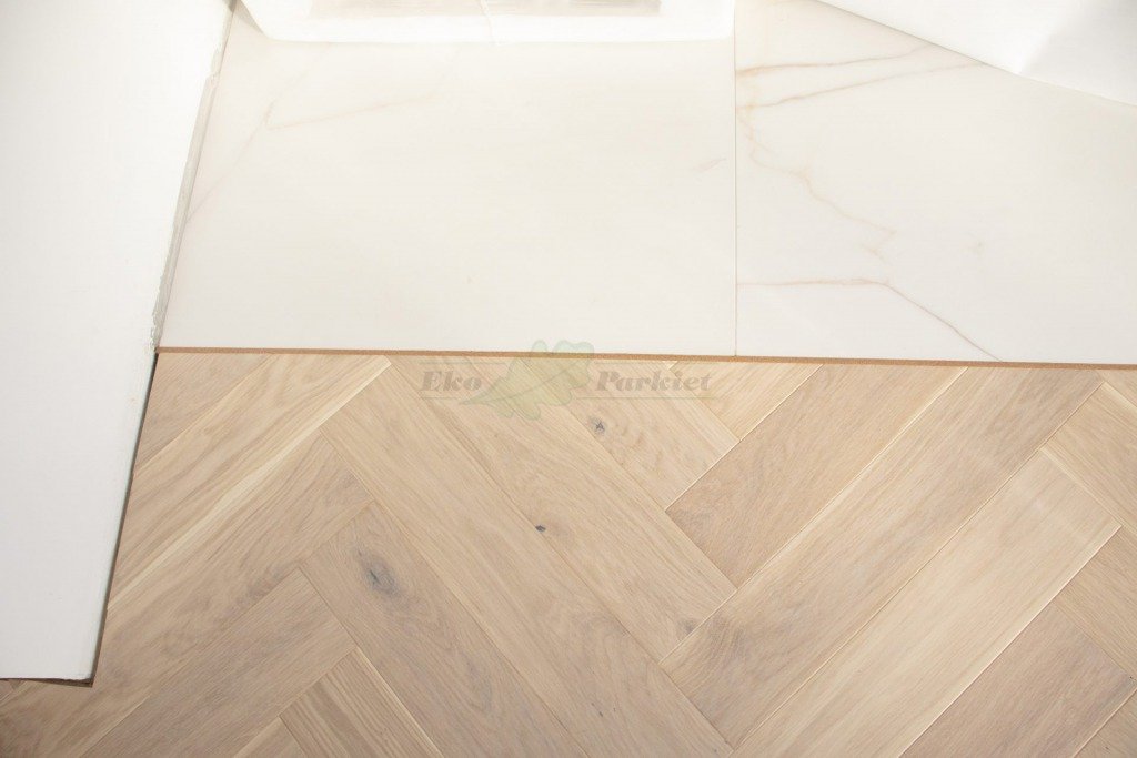 Montaż podłogi w budynku mieszkalnym, wzór jodełki klasycznej na HDFie z zamkiem 5G Dąb Gobi kl. Rustykalna, wykończona lakierem UV, deska szczotkowana i fazowana czterostronnie. Dodatkowo między gresem, a podłogą drewnianą został wmontowany korek dylatacyjny.