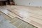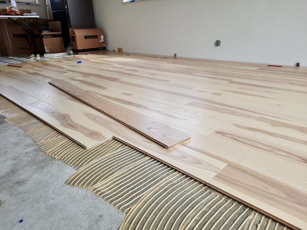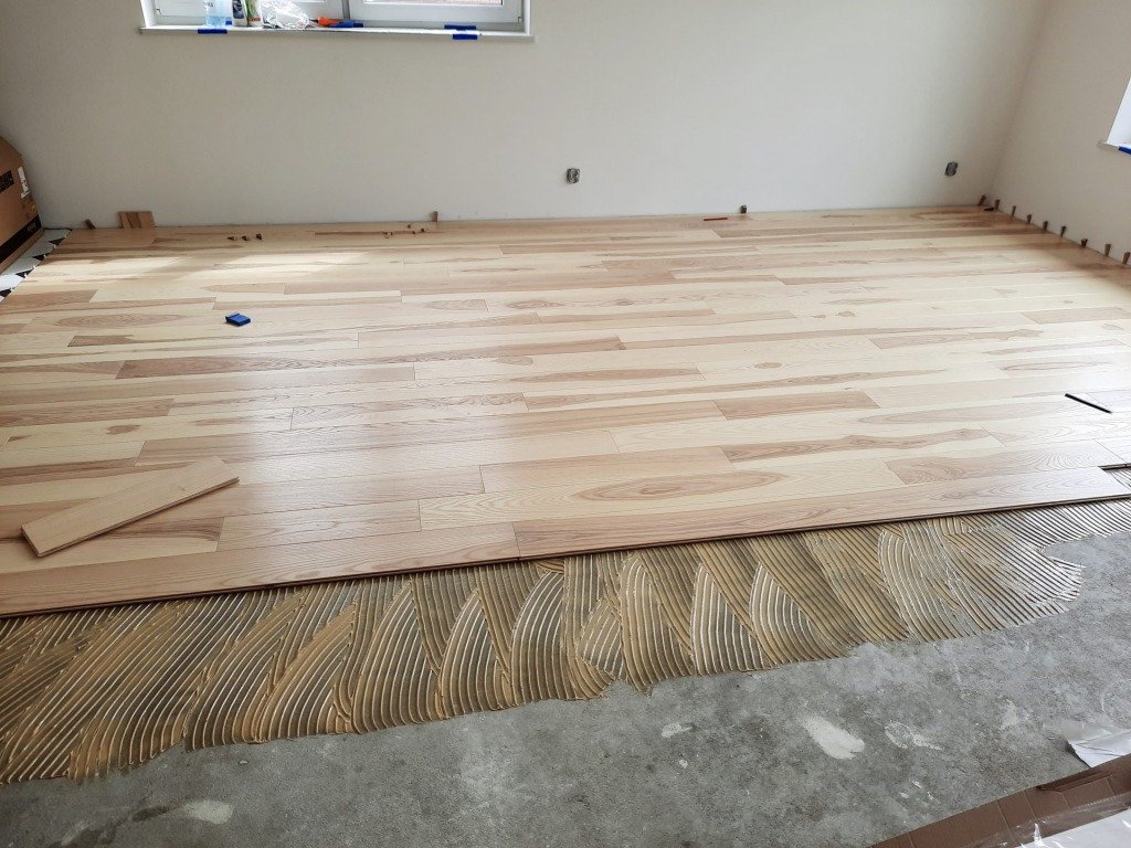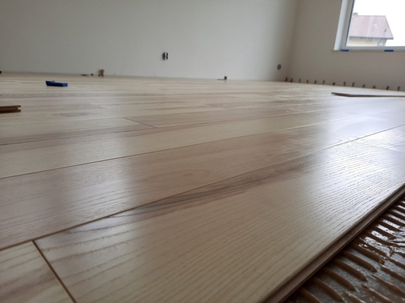 Zdjęcia z montażu podłogi w budynku mieszkalnym, na ogrzewaniu podłogowym. Piękna jesionowa podłoga Kodos, wykończona woskiem olejnym, fazowana czterostronnie.