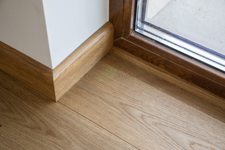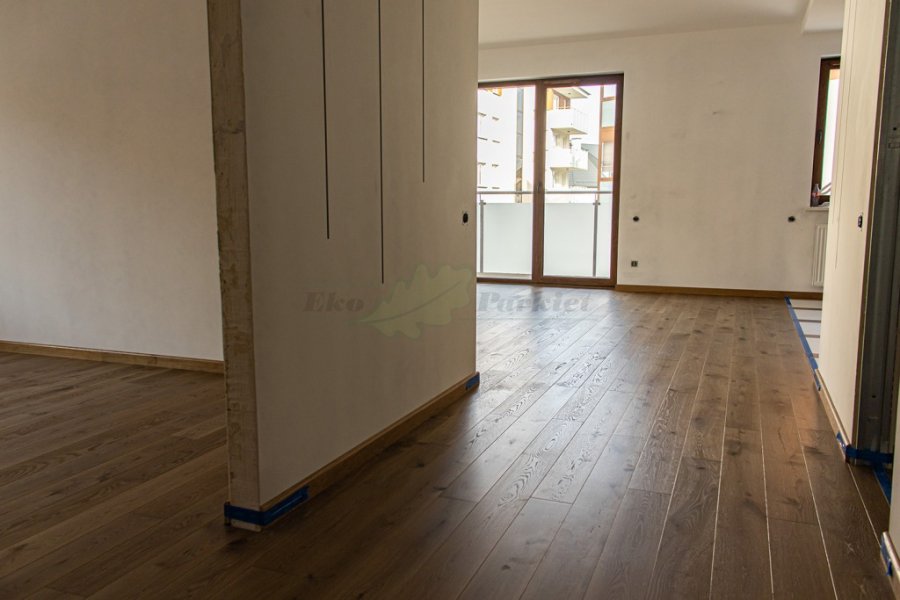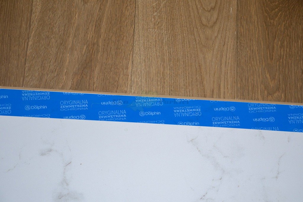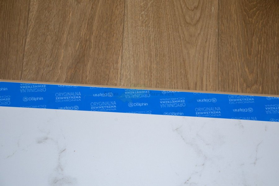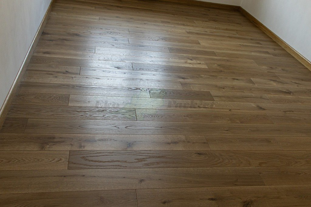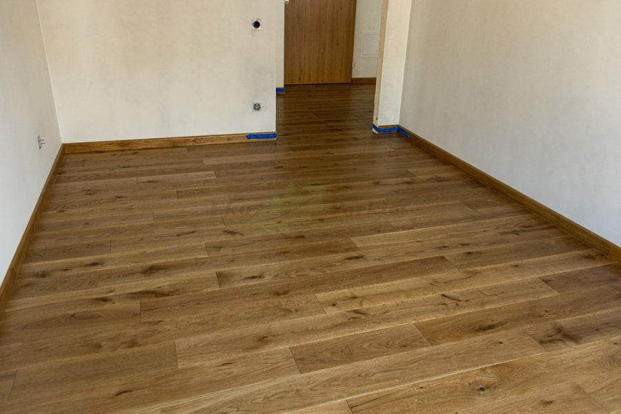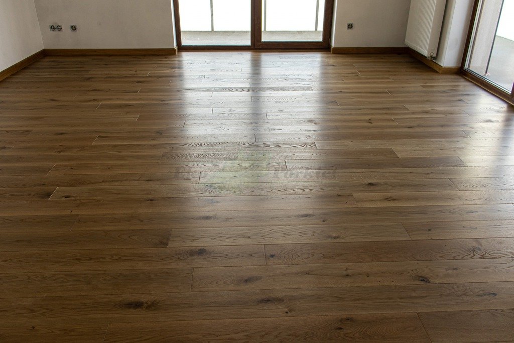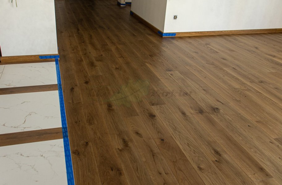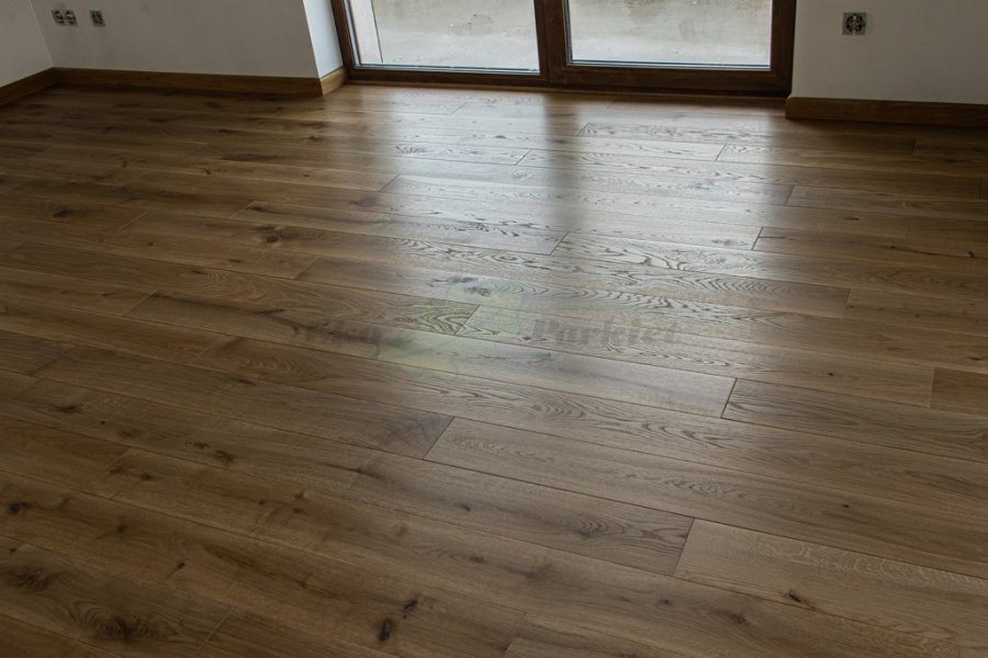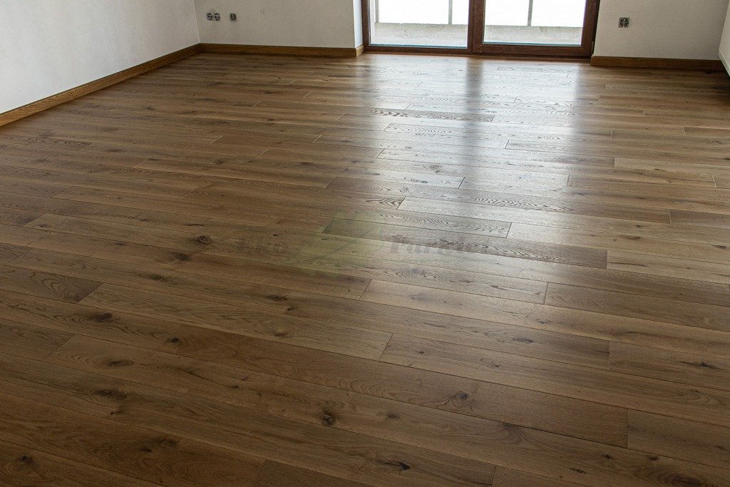 Montaż podłogi w budynku mieszkalnym, Dąb Vecchia wybarwiony na indywidualne zamówienie klienta – kontynuacja dekoru wycofanego z produkcji. Deska wykończona olejowoskiem, szczotkowana i fazowana czterostronnie. Zostały zamontowane listwy przyścienne lite, dębowe wybarwione w kolorze podłogi. Między gresem, a podłogą drewnianą zostały wykonane dylatacje w formie silikonu. Dodatkowo została zabezpieczona środkiem pielęgnacyjnym firmy Osmo.